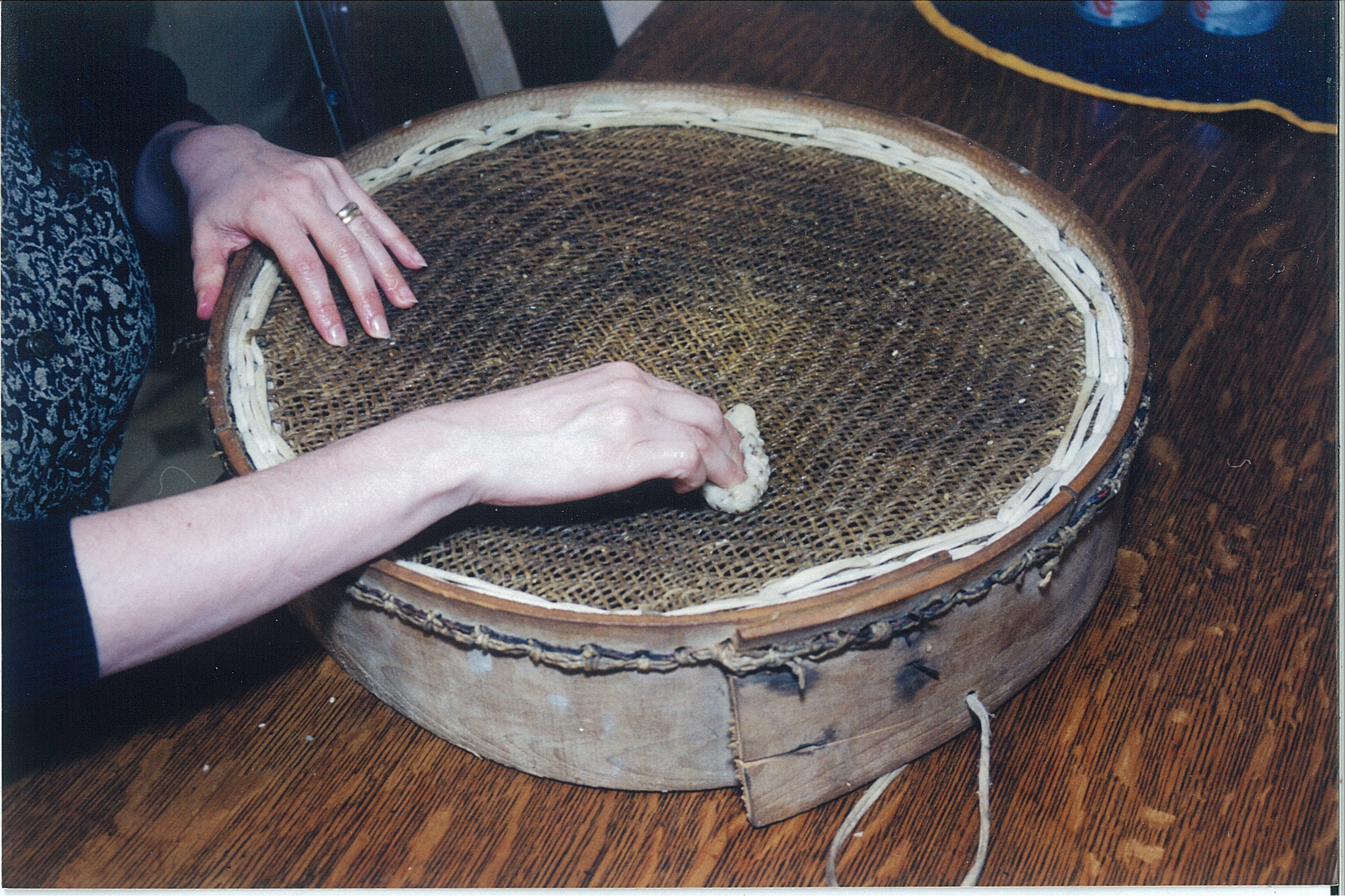 Traditionally the cookies are shaped by rolling the fingers of dough on a ‘GHOURBAAL’ – a large wooden sphere, finely and tautly webbed with strings of lamb gut. A GHOURBAAL is a basic utensil in a Middle Eastern home; it is used mainly for sifting grains.