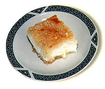 Piece of harissy with cheeseIf you choose to make Harissy with cheese then do the following: Spread out half the batter into the baking tray, smooth over 1 kg (2 lbs or 4 cups) of ricotta cheese, then cover the cheese with the rest of the batter, and proceed as noted above.
